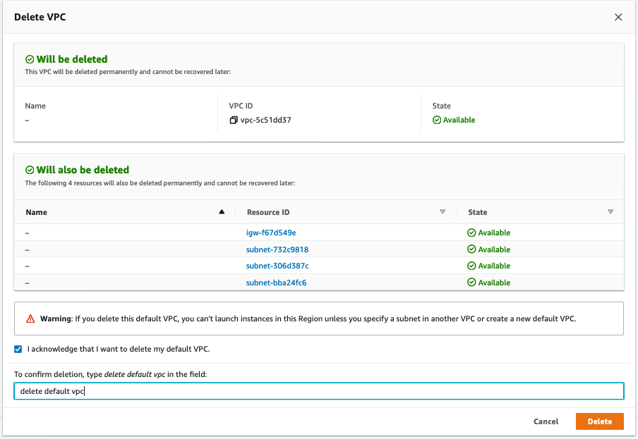 勾选 I acknowledge that I want to delete my default VPC. 复选框。