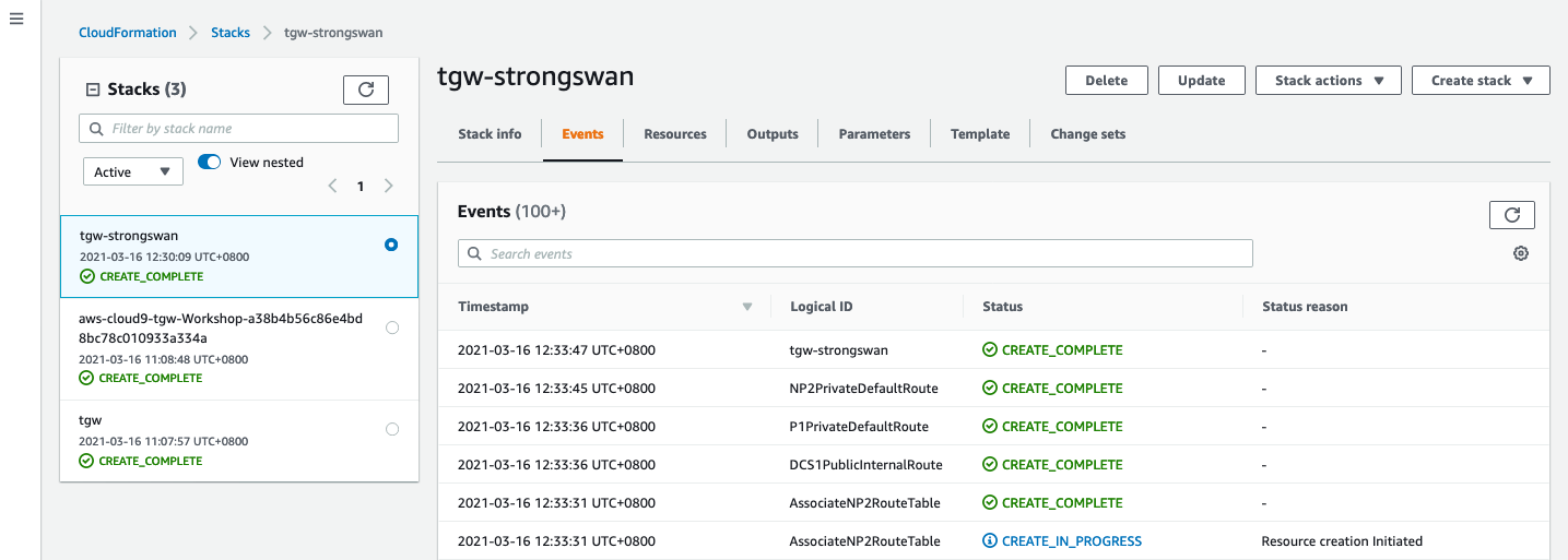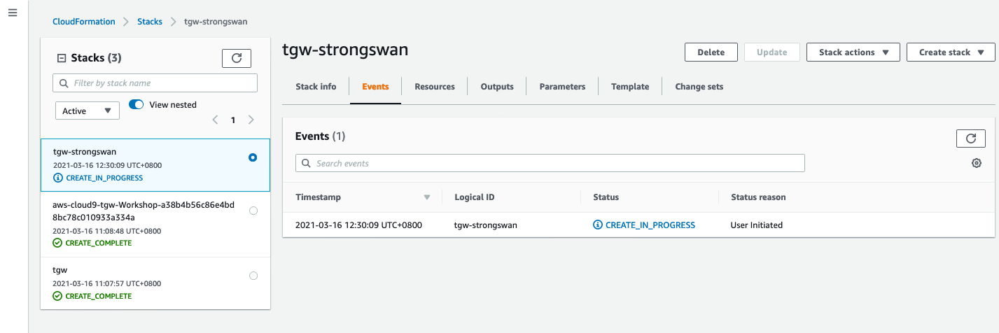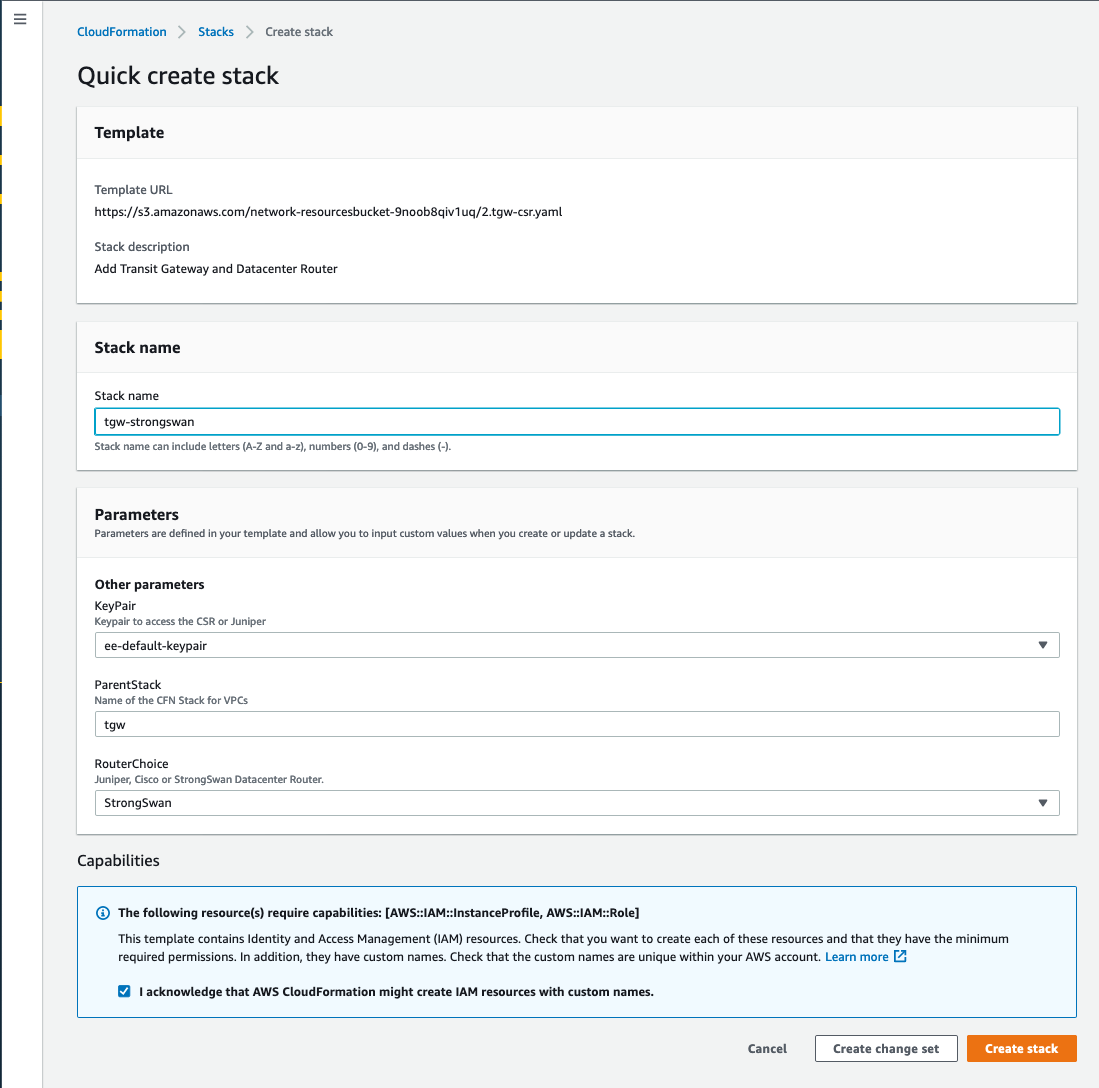 现在,我们准备开始我们的网络链接和路由策略。运行CloudFormation 以部署Transit gateway,路由表和数据中心(模拟)路由器(StrongSwan)。