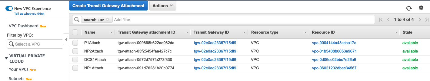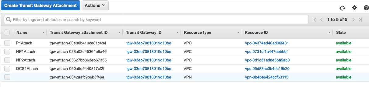 您将看到列出的VPC attachment, 已经连接到了 Production VPC1, Non-Prod VPC1, Non-Prod VPC2, 及 DataCenterService VPC.