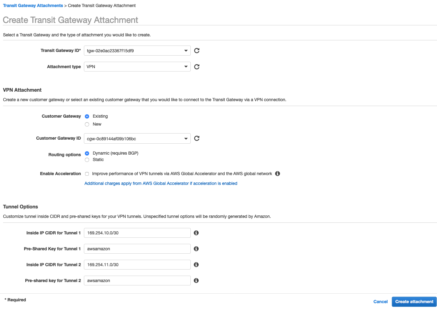 点击 Create attachment 创建 Trainsit gateway attachment.
