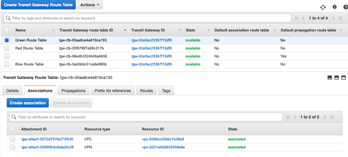在“Green Route Table”中,我们已经有了一个attachment,即“Datacenter Services VPC”。 在“Associations”标签中单击“create association”。从下拉列表中,选择 resource type 是 VPN。