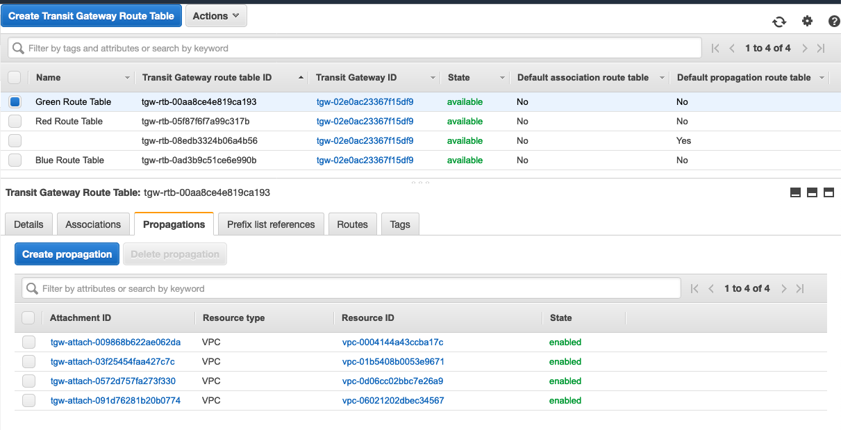 4.针对 对“Red Route Table”和“Blue Route Table”,在在“Propagations”选项卡上,重复上述步骤。
