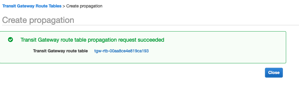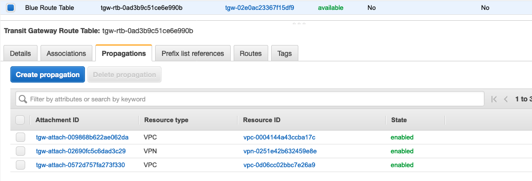 确保 “Blue Route Table”,已经成功加入 Propagations.如下图所示。