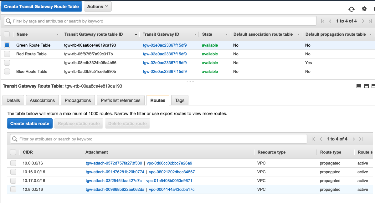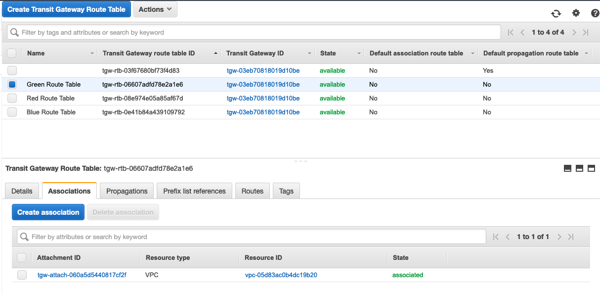 1.从左侧的菜单中选择“Transit Gateway Route Tables”。从主面板的表中选择 [Green Route Table]。然后点击 [Associations] 标签。Associations 意味着从外部流向Transit网关的流量将使用此路由表来了解数据包在通过TGW路由后的去向。