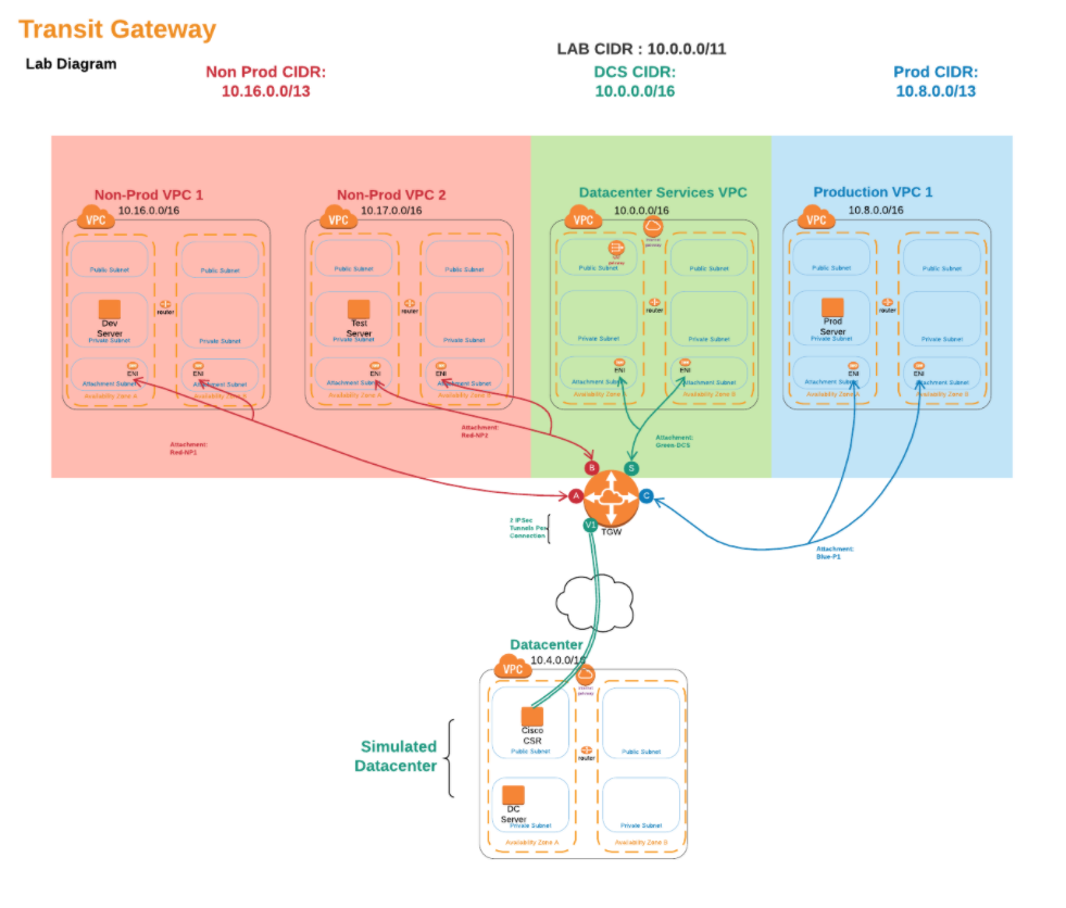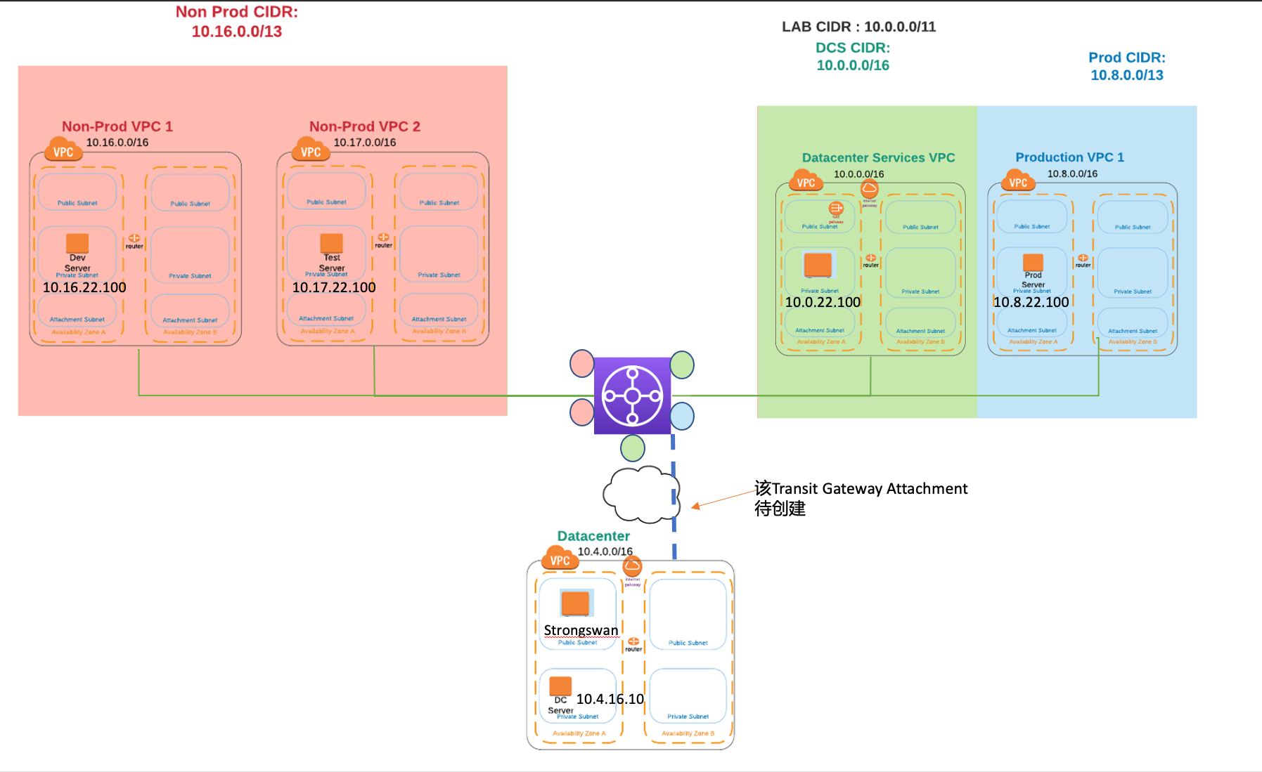 但还没没有连接到 Datacenter VPC (如下图中的蓝色虚线所示), 需要我们手工创建 VPC attachment。